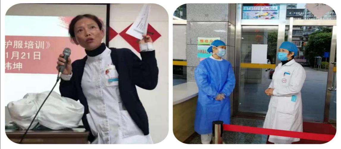 大内科洪丽端护士长也是抗非典防控的老同志,作为大内科护理管理者,肩负着内科病房、急诊科及发热门诊的护理管理及救治工作的重任,带领大内科护士们共同投入防疫阻击战。从文正楼发热门诊的筹备,请领各种防护用具、物品,协调护理员、保洁员,张贴各类标识,检查各项消毒设施……工作繁琐,任务重大,用了短短两天时间就迅速启用了文正楼发热门诊,为我院防控工作做好了铺垫。她经常是内科病房、急诊科、发热门诊三边跑,忙得一早上都没喝上一口水,本来就有的慢性咽炎加重了,她还带病继续坚持上班,始终坚持在防控一线。她说:“在我心中,一直驻扎着一位提灯女神----南丁格尔,护理界的先驱,她的精神,指引着我前进的路。做为一名党员,一名医务工作者,此时国家有难,人民有难,我不上,谁上?”